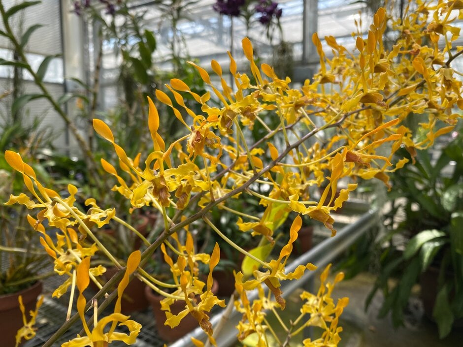 Dendrobium are epiphytic and terrestrial orchids with elongated, stem-like pseudobulbs bearing linear to ovate leaves. Racemes or panicles of showy flowers are produced from nodes along the stems mainly in spring