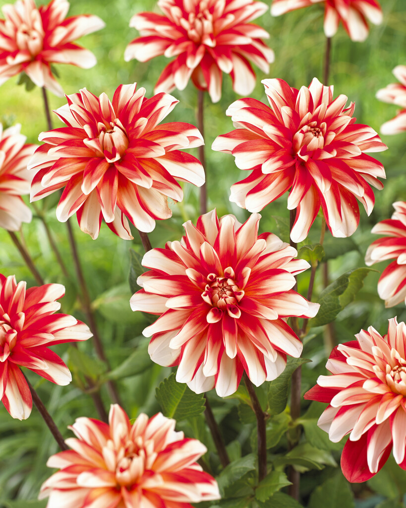 Tuberous-rooted, clump-forming perennial to about 80cm tall, with dark green leaves. Prolific, fully double flowers, produced from midsummer until the first frosts, are bi-coloured red, heavily tipped white, with slightly incurved petals, to 15cm across