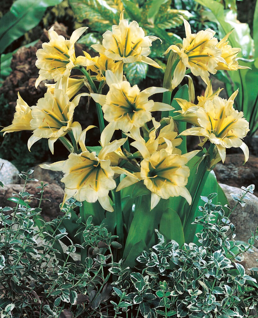 Evergreen, bulbous perennial with strap-shaped, dark green basal leaves to 60cm long. Produces stems of up to 6 fragrant flowers, to 15cm across, with long, creamy yellow outer petals and green-striped yellow tubes, from spring to summer