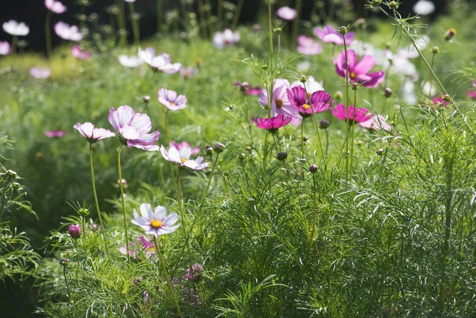 A compact, strong and sturdy half-hardy annual with feathery green foliage and single, pale pink, dark pink and white flowers which appear from July through to October. These make good cut flowers and are very beneficial to pollinating insects