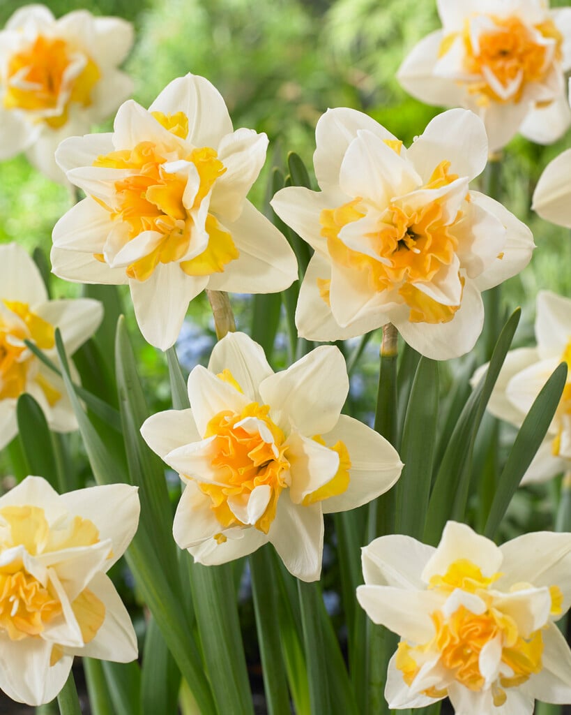 A double daffodil to 35cm, flowering in mid-spring. Blooms have an outer whorl of broad, cream petals, the centre filled with narrow cream petals interspersed with large, orangey-yellow cup segments ICRA Registration description: Fl. 108mm wide; perianth and other petaloid segments in three or more whorls, roundish, white, smooth and of heavy substance; the outer whorls 46mm long, very broad, blunt, slightly mucronate, reflexed, with midrib showing, margins incurved or wavy, overlapping to half; the inner segments narrower, less prominently mucronate; the inner whorls narrower, more nearly ovate, with margins incurling, successively shorter and more strongly inflexed towards centre; corona segments 26mm long, interspersed among the inner petaloid segments and clustered at centre, bi-lobed, wavy to frilled. Mid-season