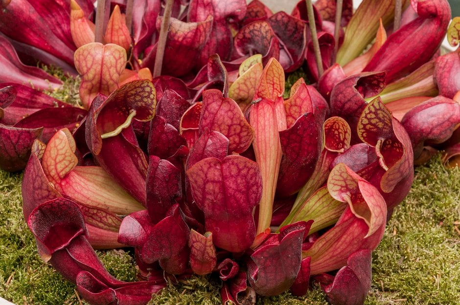 Sarracenia can be evergreen or herbaceous, rhizomatous perennials with rosettes of phyllodes mostly modified into insect-catching tubular pitchers with hooded lids, and solitary, nodding cup-shaped flowers in spring
