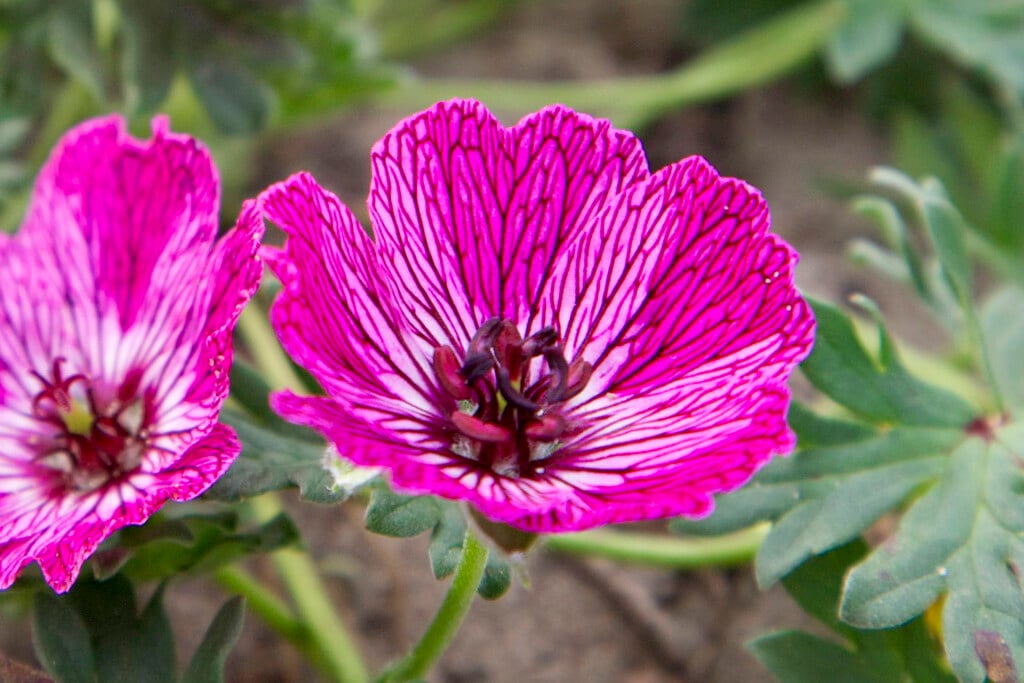 Geranium can be annuals, biennials and perennials, herbaceous or evergreen, with rounded, usually palmately lobed or divided leaves, and lax inflorescences of rounded, 5-petalled flowers