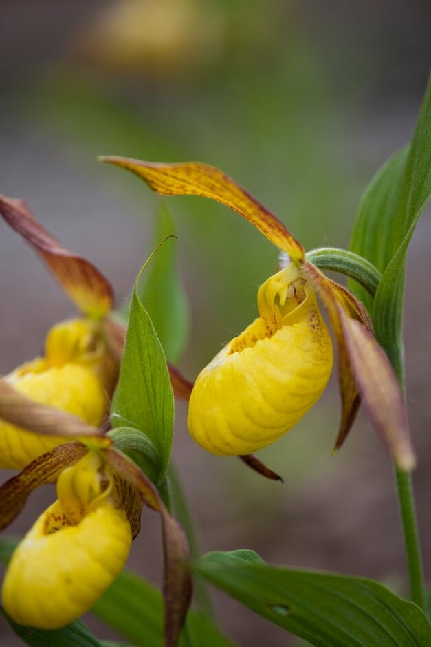 Lukas is a deciduous, hardy orchid producing upright stems with oval, parallel-veined leaves. One to three flowers comprising bright yellow pouches and tepals striped and speckled with deep purple to brown markings are borne in spring