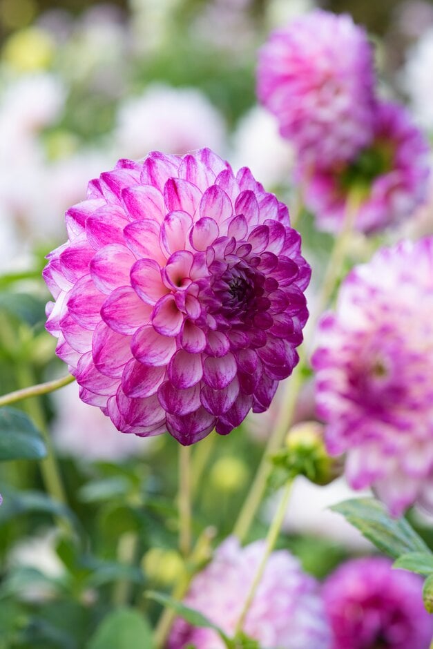 A bushy, clump-forming, tuberous, deciduous herbaceous perennial with dark green leaves. Rich lavender-purple ball-shaped flowers fading to white, with lavender-purple edges, appear from summer through until the first frosts of autumn. Good as a cut flower or in a flower border display