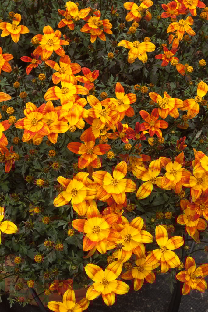 Bidens can be annuals, perennials or deciduous shrubs, with opposite, simple or pinnately-divided leaves and daisy-like or disc-like flowerheads in summer
