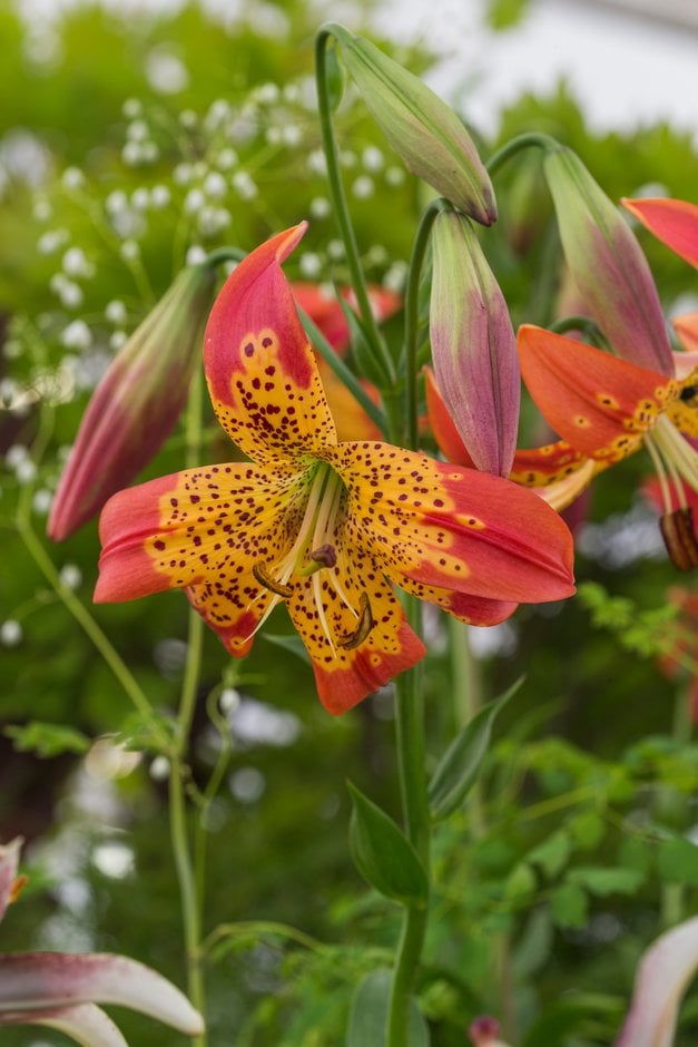 A bulbous perennial with whorls of leaves on upright stems to about 1m tall. Flowers, produced in mid- to late summer, are yellow in the centre, spotted with dark red, with recurved petals shading to orange-red at the tips