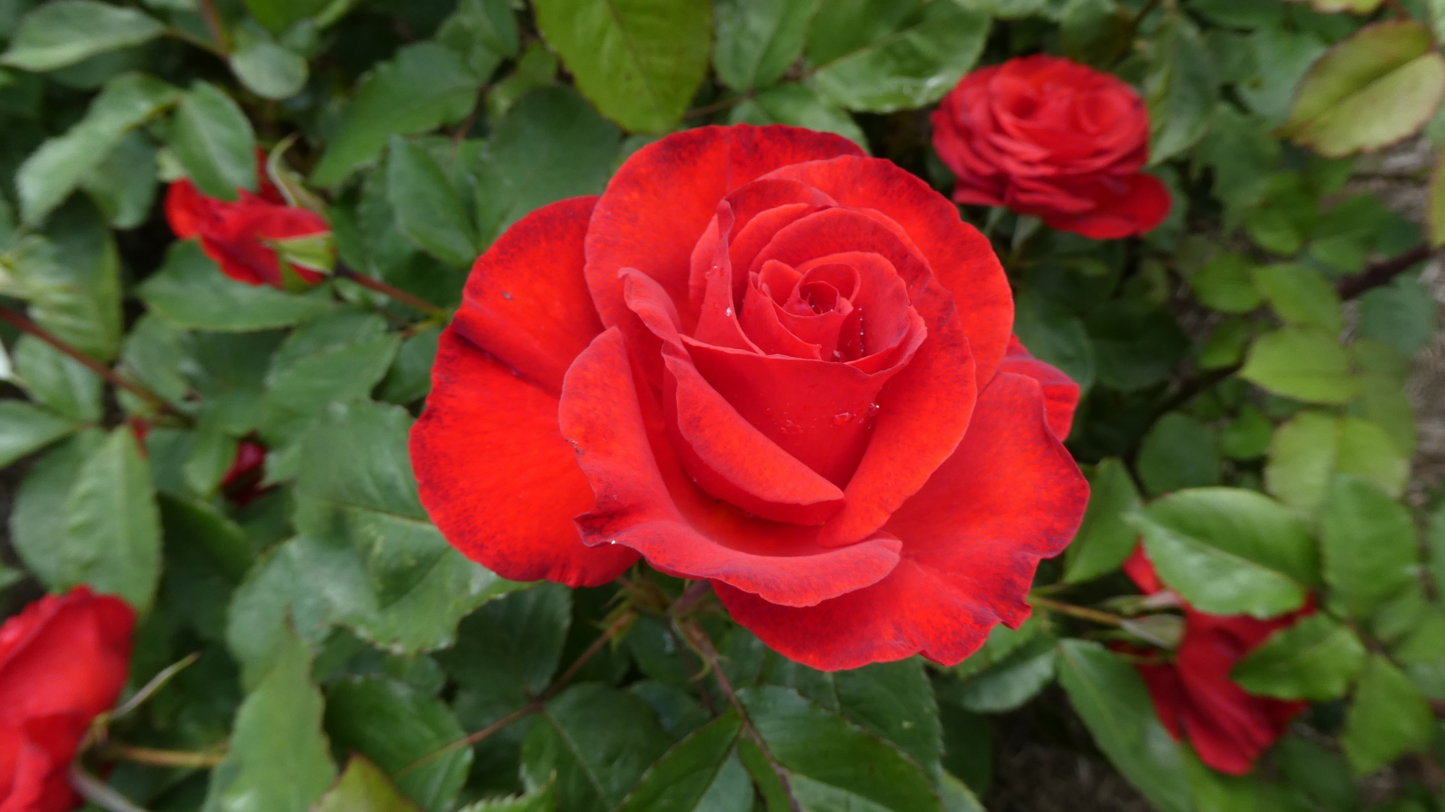 A bushy upright rose, about 1.2m tall, with healthy mid-green foliage tinted reddish-purple when young. Scrolled buds open to lightly scented well-formed, fully double, bright red blooms carried on long stems, repeat-flowering from early summer to late in autumn