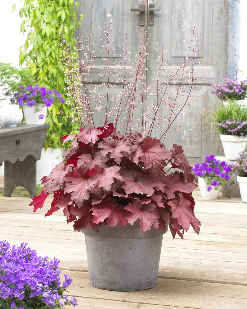 Heuchera are more or less evergreen, clump-forming perennials with attractive, rounded, shallowly palmately lobed leaves and racemes or panicles of small, tubular flowers, often with colourful calyces