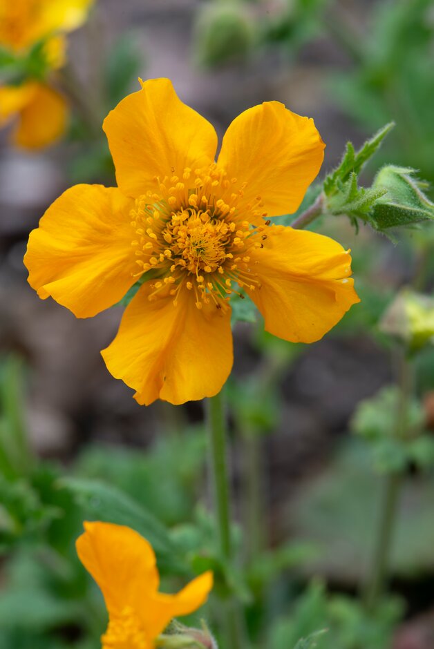 Geum are rhizomatous perennials, occasionally spreading by stolons, with a basal rosette of pinnately lobed leaves and saucer-shaped flowers in loose clusters
