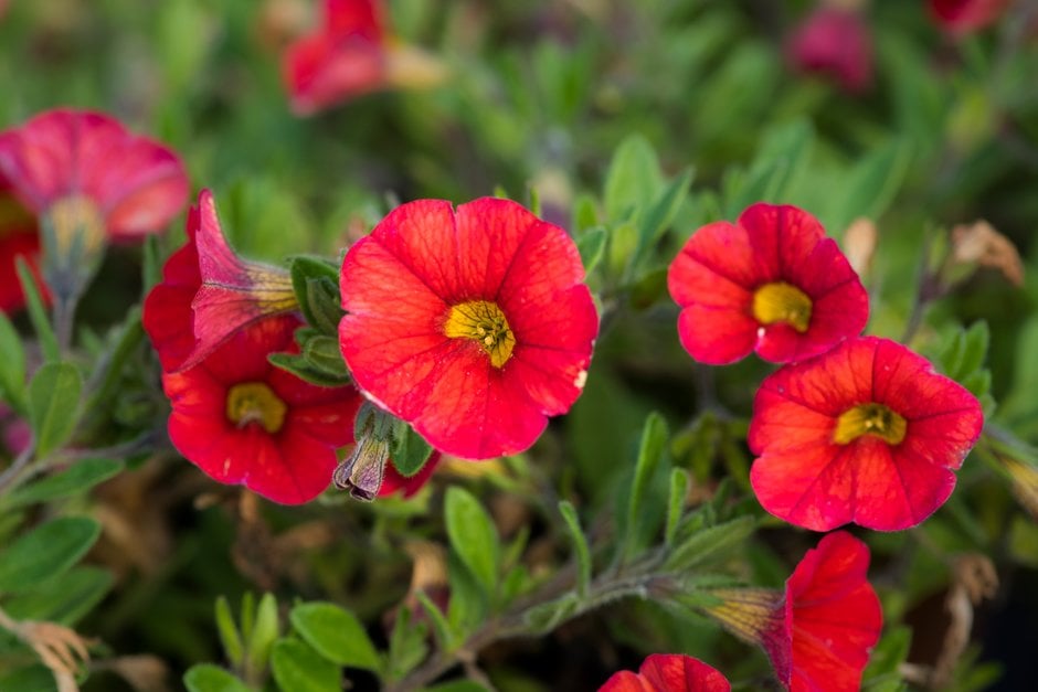 Calibrachoa are tender woody-based perennials usually grown as annuals, mostly trailing in habit, with simple leaves and petunia-like, trumpet-shaped flowers over a long period