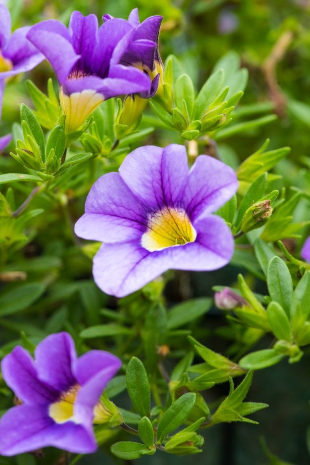 Calibrachoa are tender woody-based perennials usually grown as annuals, mostly trailing in habit, with simple leaves and petunia-like, trumpet-shaped flowers over a long period