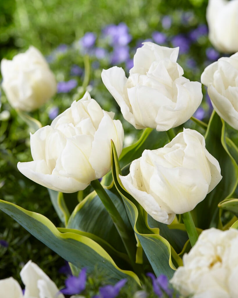 - Double Early Group tulips flower in mid-spring, with double, bowl-shaped flowers, sometimes flecked with a contrasting colour