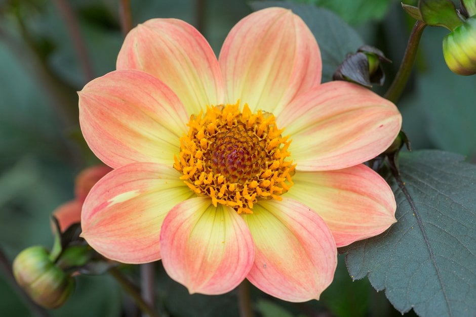 Single-flowered dahlias have flowerheads usually less than 10cm across, with one or two rows of spreading ray florets, surrounding a central boss of small tubular disc florets which are valuable for bees and butterflies