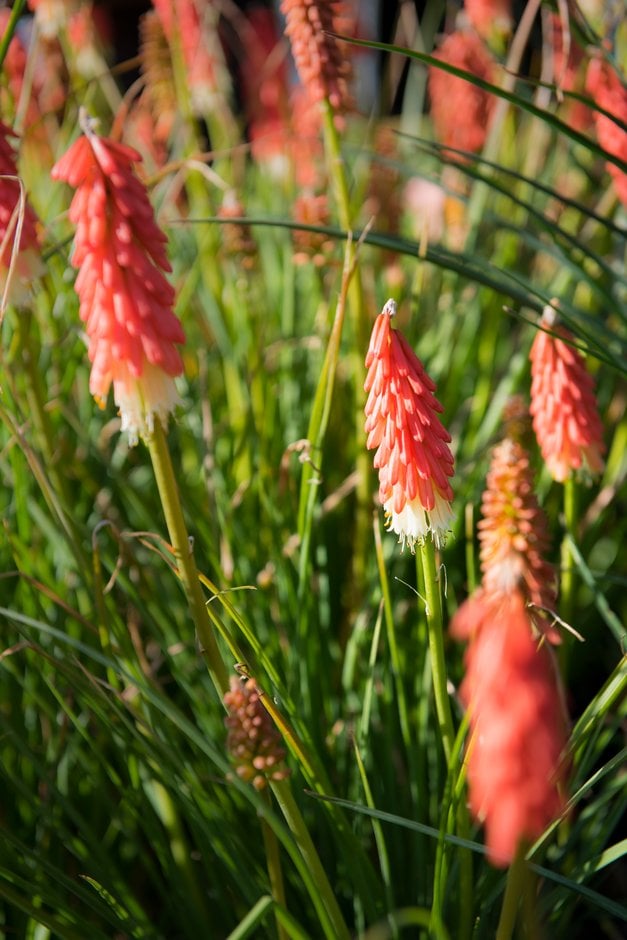 An upright, clump-forming perennial to around 70cm tall with narrow, arching leaves. Spikes of dark orange to red flowers with a skirt of white to pale yellow flowers at the base of the spike are borne from summer into autumn