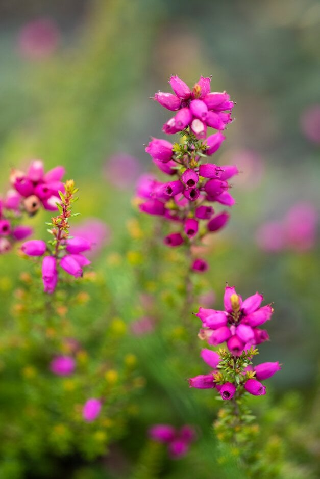 Erica can be prostrate or erect, evergreen shrubs with fine, needle-like leaves in whorls, and racemes or panicles of small, bell-shaped or tubular flowers
