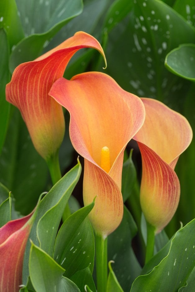 Zantedeschia can be deciduous or semi-evergreen, tuberous perennials with lance-shaped or arrow-shaped leaves and tiny yellow flowers forming a dense spike-like spadix, with a showy, hood-like spathe, sometimes followed by orange berry-like fruits