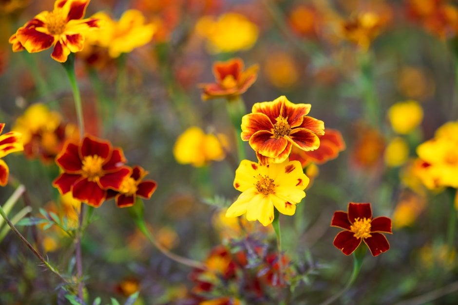 Tagetes can be annuals or perennials of upright growth, with strongly aromatic pinnately divided leaves and showy daisy-like, single or double flower-heads in summer and autumn