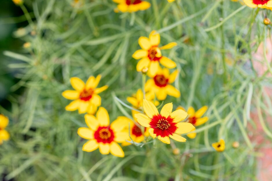 Coreopsis can be annuals or perennials, with paired, simple, palmate or pinnately divided leaves and long-stalked, daisy-like flower-heads
