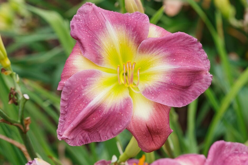 An herbaceous perennial that reaches approximately 86cm in height when in flower. It forms a clump of arching, strap-like green leaves and very flat, upward-facing lavender-pink flowers with a darker pink halo and large yellow-green throats to 17cm across in summer