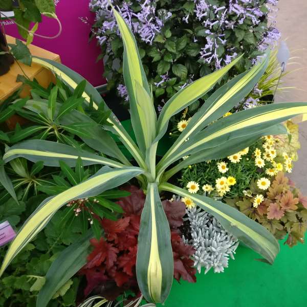 A herbaceous perennial with rosettes 0.5-1m high of evergreen, succulent, lance-shaped leaves, variegated yellow and grey-green; mature plants may produce bright pink stems up to 1.5m high of lime-green flowers with mauve-pink bracts, in midsummer