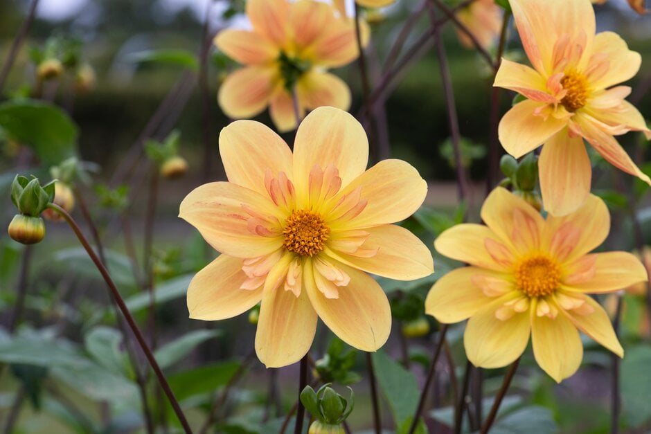 A clump-forming, deciduous, tuberous perennial with dark green leaves. Large, open orange and apricot flowers, darker orange on the reverse, appear from June until the first frosts. Good for a mixed flower border or for exhibitions