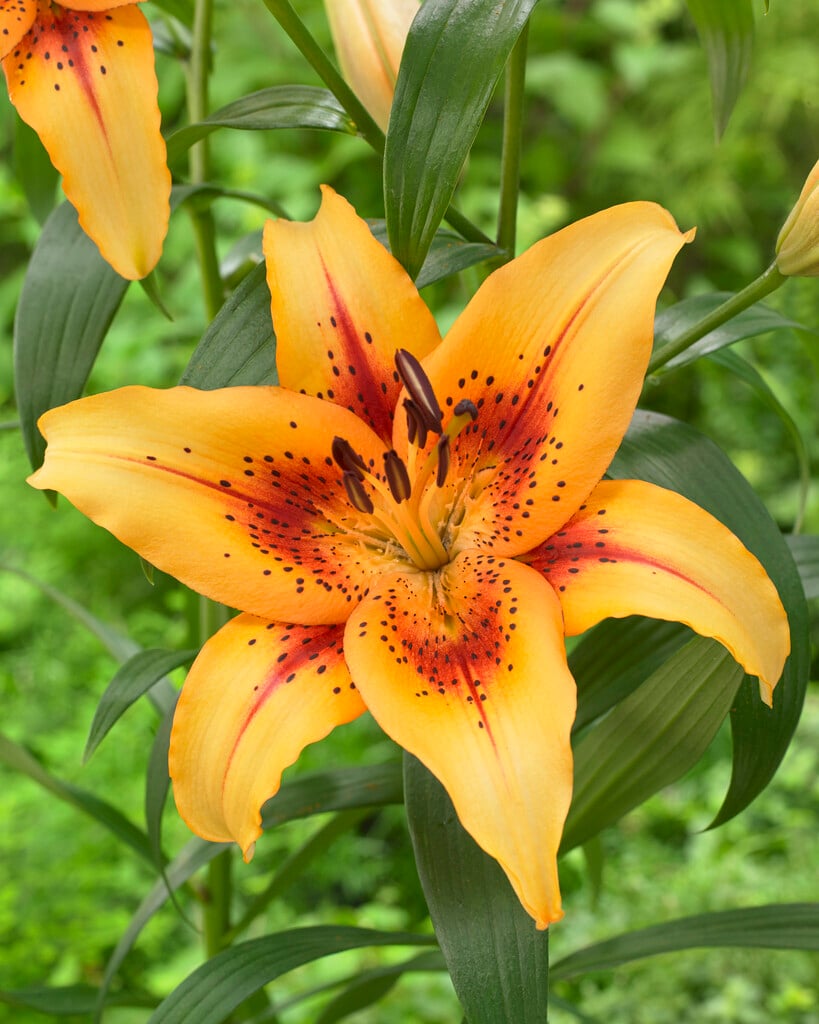 A bulbous perennial, to around 1m high, with upright stems and lance-shaped, glossy dark green leaves. Large, outward-facing, golden orange flowers, with a red flare and dark red-brown spots in the centre, are produced in early to mid summer