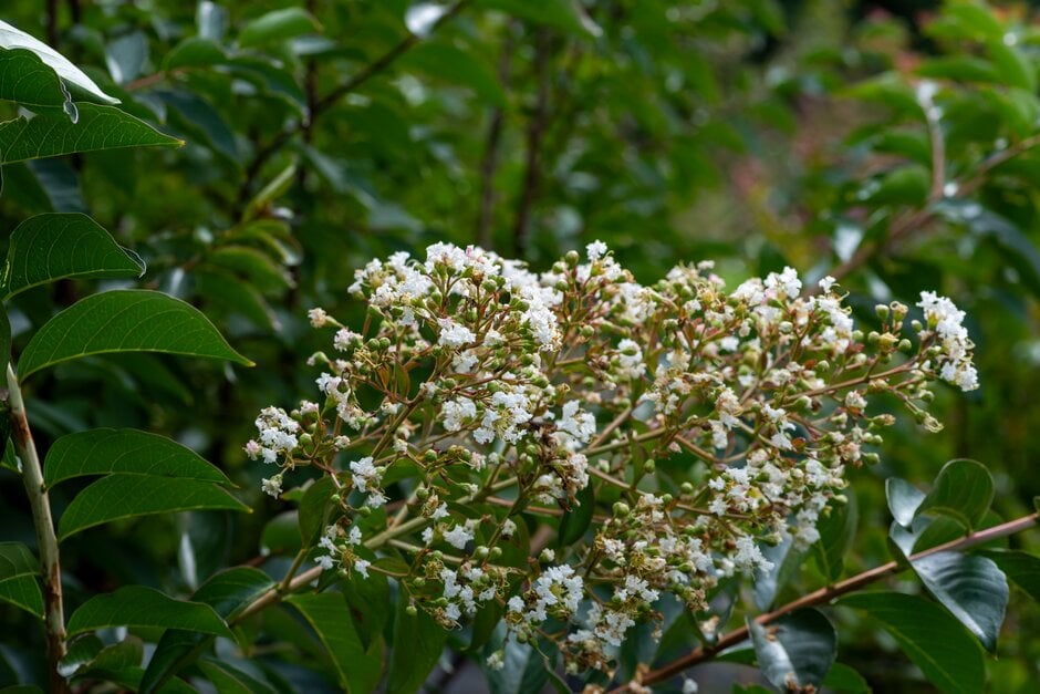 Lagerstroemia can be deciduous or evergreen trees or shrubs, with simple leaves and conical panicles of flowers with ruffled petals; some have attractive peeling bark