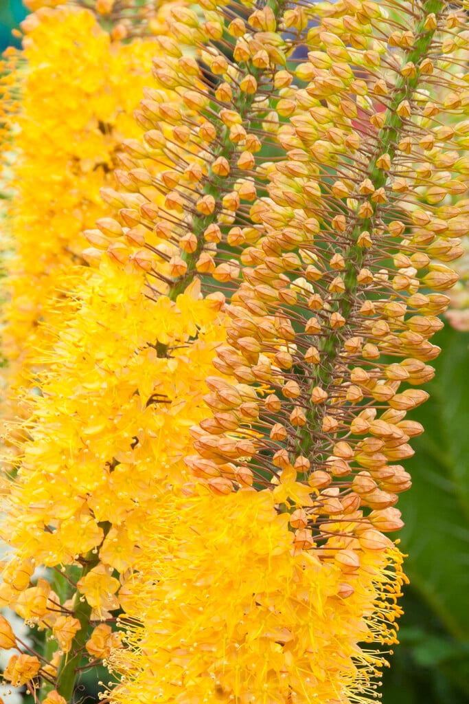 A clump-forming perennial to 1.5m high, with fleshy roots and narrowly lance-shaped, mid green leaves that die back after flowering. Tall spikes of small, pale orange buds are produced in early summer, and gradually open to densely packed, bright golden yellow flowers with conspicuous orange anthers