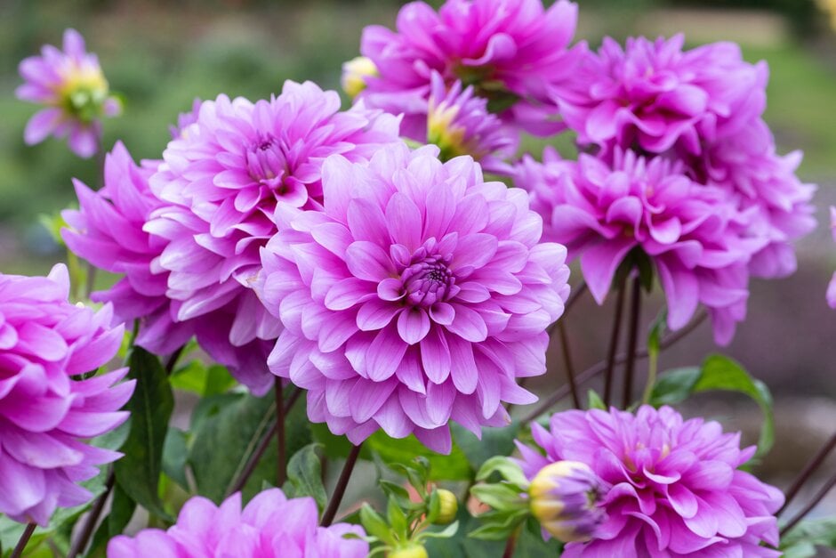 Decorative dahlias have fully double flowerheads with flat or slightly incurved florets