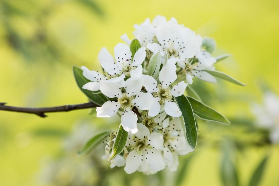 Pyrus are deciduous trees or shrubs with oval leaves and scented white flowers in spring, followed by green or brown fruits, edible in some species