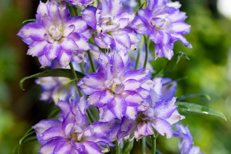 A vigorous clump-forming herbaceous perennial with long stalks formed with divided green leaves and tall spikes packed with frilly, double purple-blue edged flowers which are white towards the centre in summer.