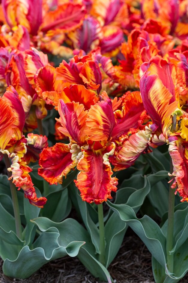 - Parrot Group tulips have single flowers, open cup-shaped, the tepals with finely cut margins and usually striped with contrasting colours, opening in mid to late spring