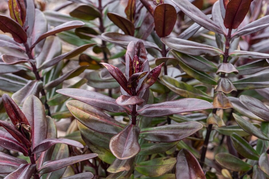A bushy evergreen shrub to around 80cm high, with broadly lance-shaped, glossy dark green leaves that are flushed dark reddish bronze when young, and in colder weather. Spikes of vivid magenta-coloured flowers are produced in summer