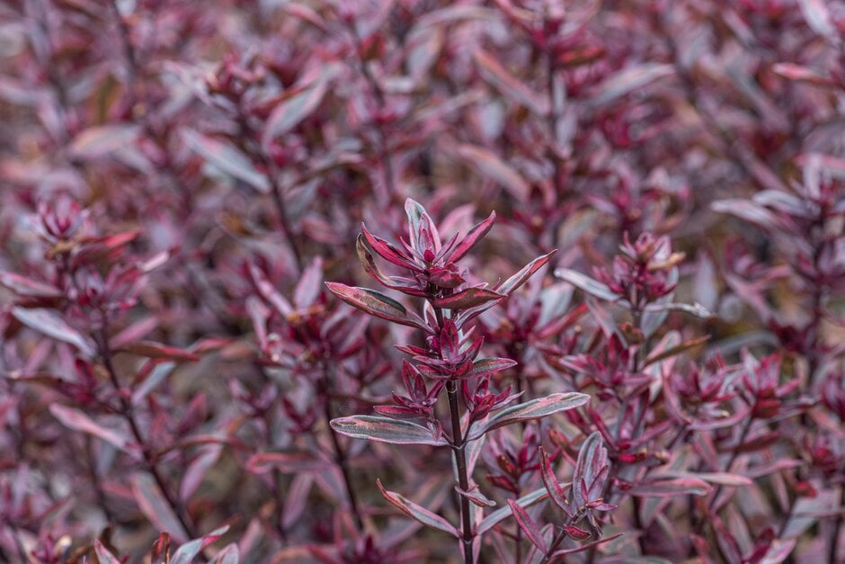 A compact shrub to 60cm tall, with narrow, green spear-shaped leaves, with cream margins. In spring, the new growth at the tips of the stems is bright pink, contrasting with the green and cream leaves lower down the stem and in autumn the foliage turns deep pink maroon. Spikes of purple flowers are produced in summer