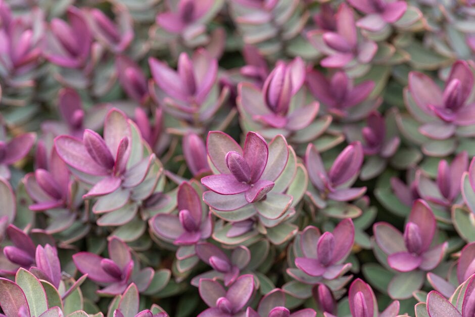 A compact, bushy evergreen shrub to around 60cm high, with a rounded habit, upright stems and small, grey-green leaves that are strongly flushed reddish-purple when young, and in cold weather. Spikes of pale purple flowers are produced in summer, though this cultivar is not free-flowering and is primarily grown for its foliage
