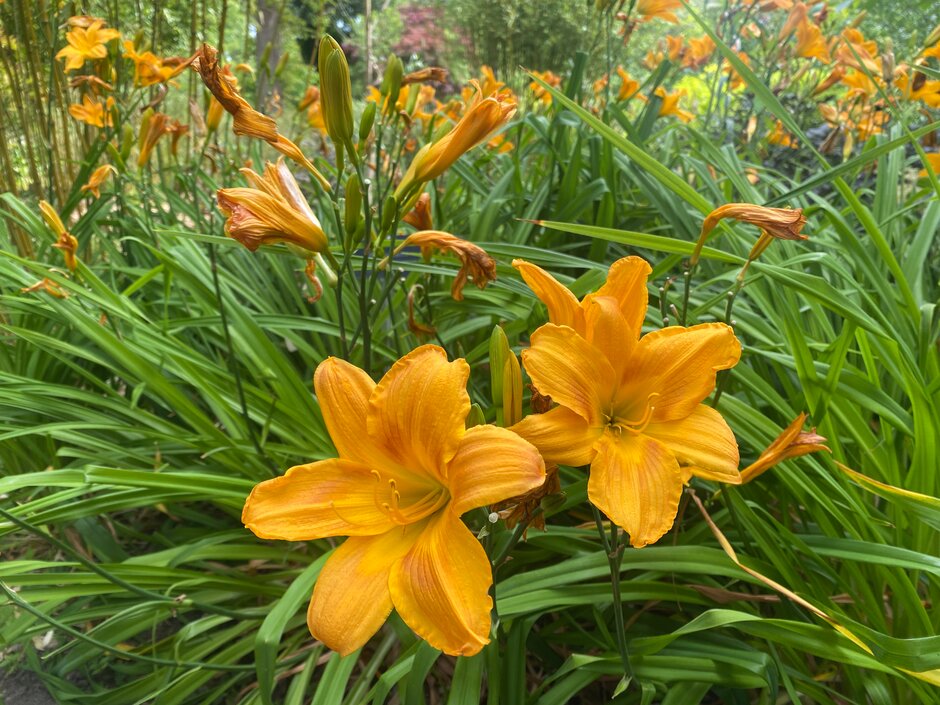 Hemerocallis may be evergreen or herbaceous perennials, with narrow, strap-shaped leaves and funnel-shaped flowers on erect stems in late spring or early summer