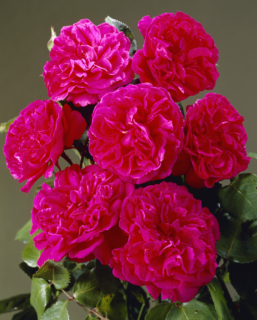 A bushy shrub rose about 1.5m tall, with large dark green leaves, and bearing very fragrant, large, full-petalled blooms of crimson-magenta aging to cerise, repeat-flowering from early summer to autumn; can be grown as a short climber
