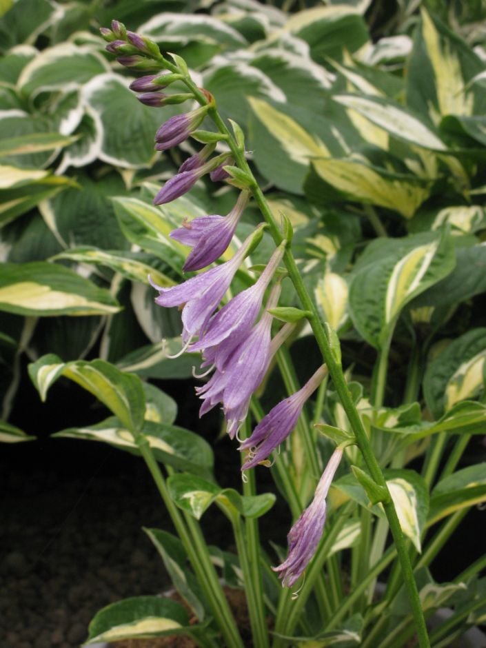 Hosta are clump-forming herbaceous perennials with simple, ovate or lance-shaped leaves, often attractively coloured or variegated, and erect racemes of nodding, funnel or bell-shaped flowers in early summer