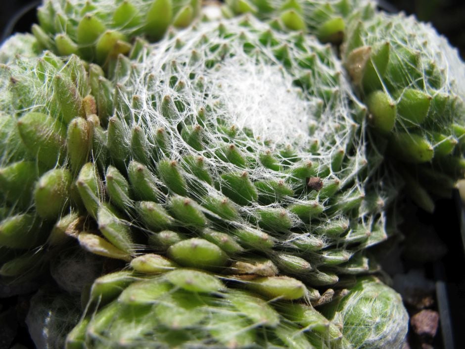 An evergreen perennial forming a mat of fleshy rosettes 1-3cm across, leaves mostly dark red, with cobwebby white hairs at the tips. Starry pink flowers 1cm in width in flatclusters on upright stems to 12cm