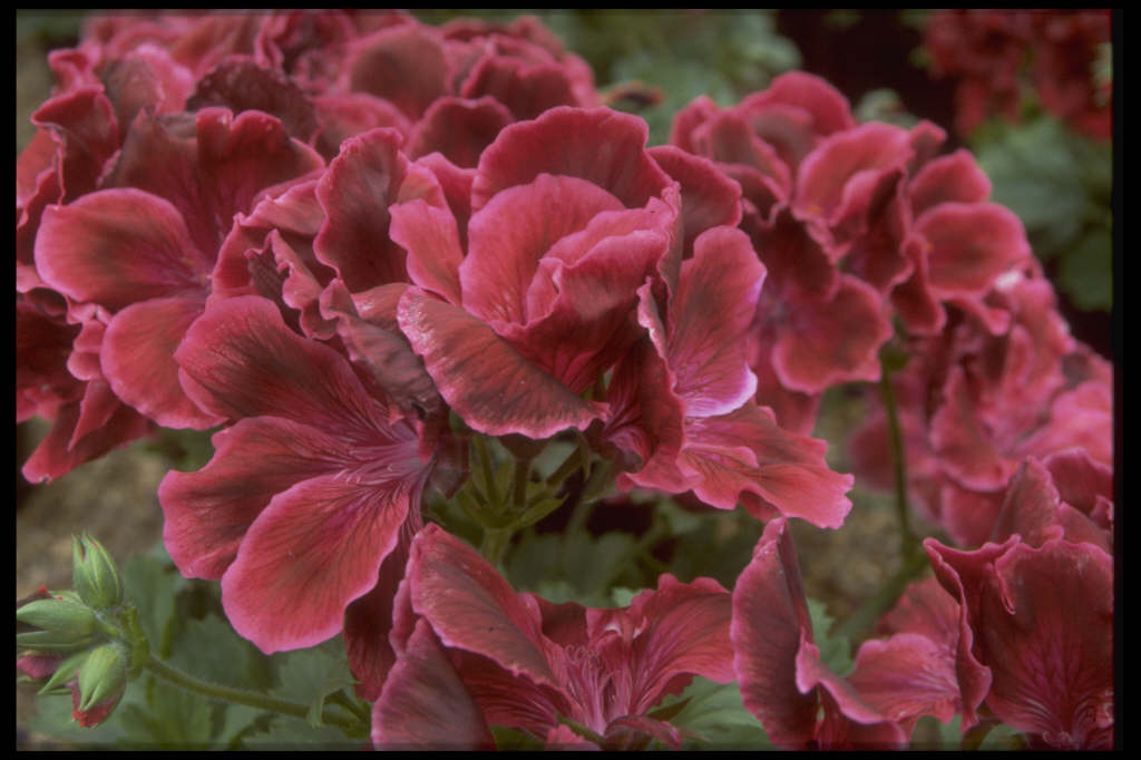 A bushy plant to 35cm in height, with bright cerise-red flowers, each petal with a central zone of deep red-purple