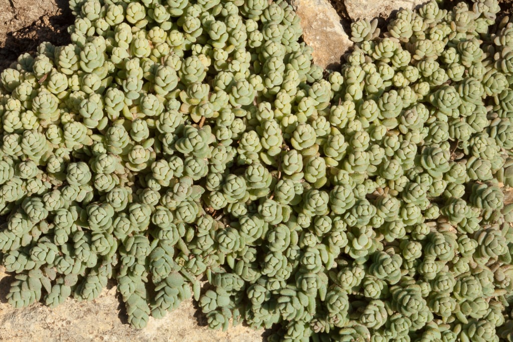 A creeping, evergreen succulent with tiny, fleshy leaves packed densely along the stems. The foliage takes on a pink or purple tinge when drought or cold stressed. In summer, white flowers are borne on slender stems above the foliage