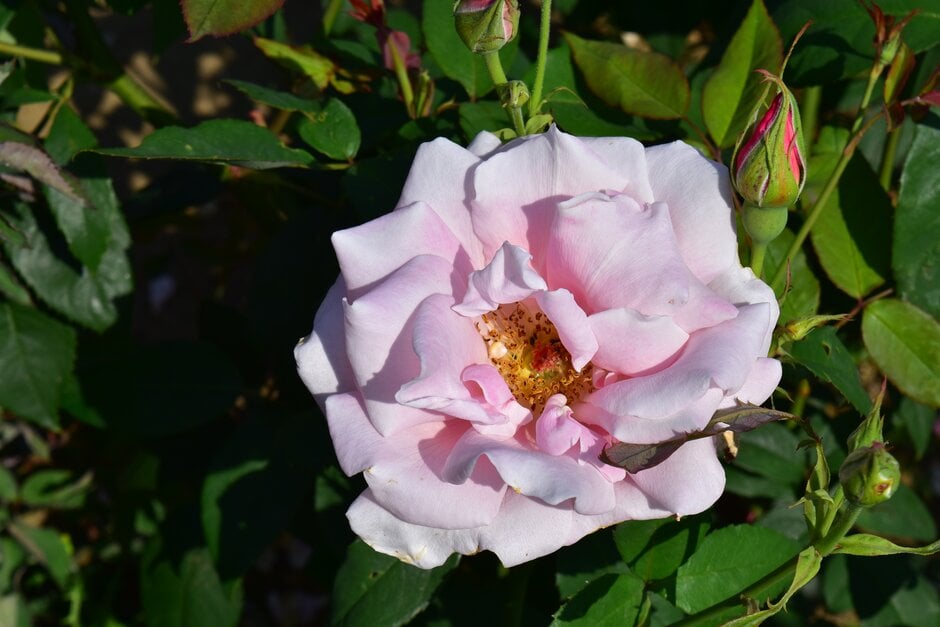 Rosa can be deciduous or semi-evergreen shrubs or scrambling climbers, with usually thorny stems bearing compound pinnate leaves and solitary or clustered flowers. Flowers may be followed by showy red or purple fruits in some varieties.