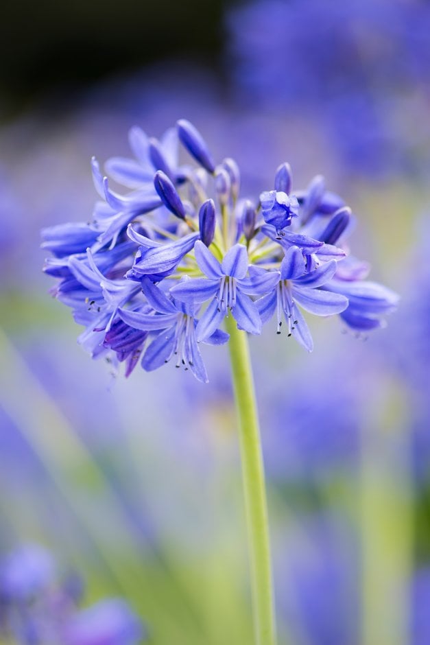Agapanthus are clump-forming perennials with narrowly strap-shaped leaves, evergreen in some species, and erect stems bearing umbels of funnel-shaped blue or white flowers