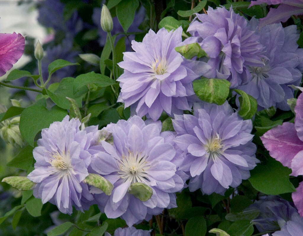 Decidous climber about 2.4m tall, with mid green leaves and double, pale lavender-mauve flowers that fade to pale blue, 15cm across with creamy-yellow anthers, composed of layers of long tepals, progressively shorter towards the middle, and occasionally a collar of lilac-green tepals, flowering late spring to early summer and again in late summer