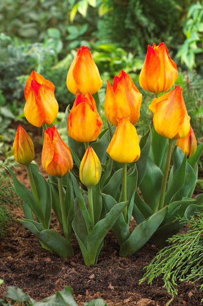 A compact perennial bulb with broadly lance shaped, greyish-green leaves. This Greigii tulip has single, cup-shaped flowers; buds are feathered from golden yellow at the base to red at the margins, and open to show strong scarlet flaming on the insides of the tepals. It flowers in mid spring and stands to about 30cm high