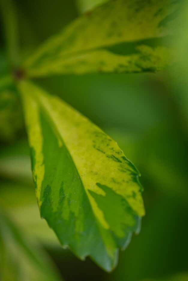 An evergreen shrub to 3m tall, with bright green leaves palmately divided into 3 or 5 obovate leaflets, splashed with bright yellow. Insignificant greenish flowers appear rarely in summer