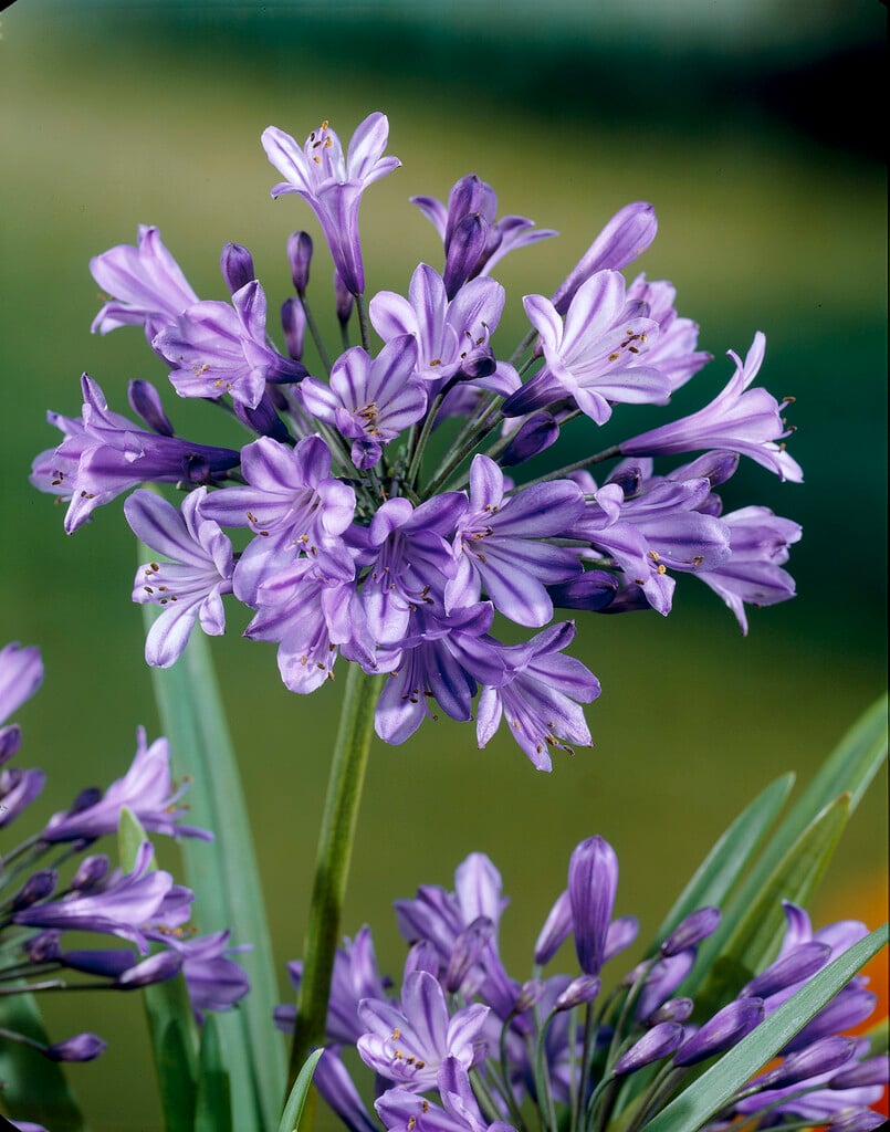Agapanthus are clump-forming perennials with narrowly strap-shaped leaves, evergreen in some species, and erect stems bearing umbels of funnel-shaped blue or white flowers