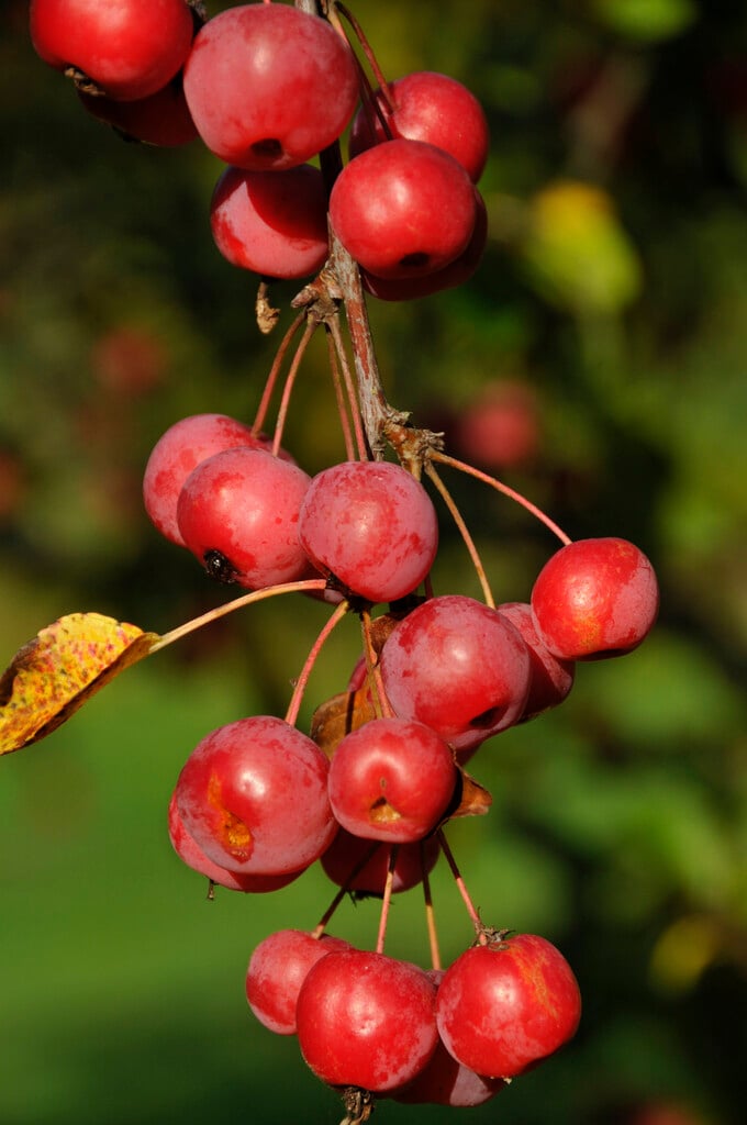 Malus are small to medium-sized deciduous trees with showy flowers in spring and ornamental or edible fruit in autumn; some have good autumn foliage colour