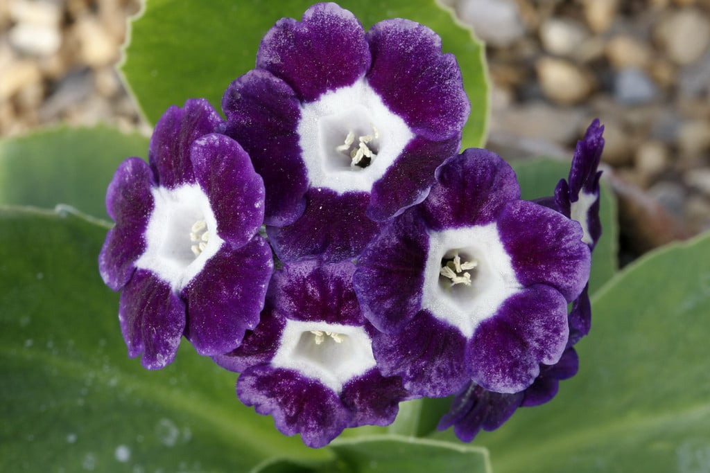 An evergreen, perennial, border auricula up to 20cm tall with rosettes of pale green leaves. Clusters of fragrant, blue-purple flowers with white or cream centres are produced on short stems in spring